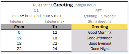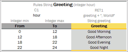 The following example illustrates the Greeting rule with the min <= value and value < max condition expression.