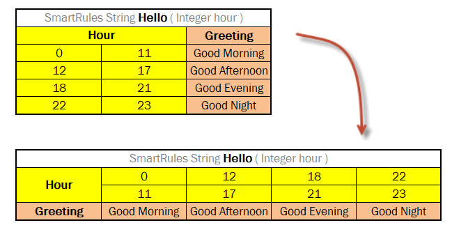 Sometimes decision tables look more convenient in the transposed format where columns become rows and rows become columns. For example, an initial and transposed version of decision table resembles the following: