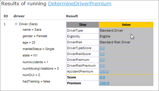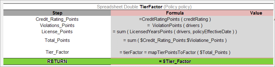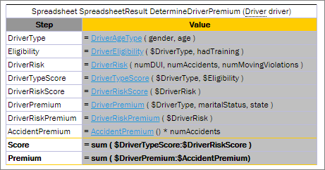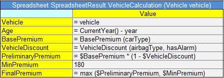 For more information on how to specify a range of cells, see Using Ranges in Spreadsheet Table. Below is an example of a spreadsheet table with different calculations for an auto insurance policy. Table cells contain simple values, formulas, references to the value of another cell, and other information.