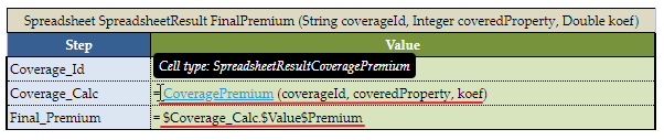 The return type is SpreadsheetResult, but it becomes SpreadsheetResultCoveragePremium data type. Now it is possible to access any calculated cell in a very simplified way without indicating its data type, for example, as displayed in the following figure.