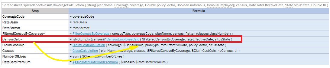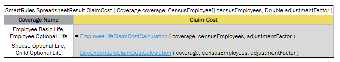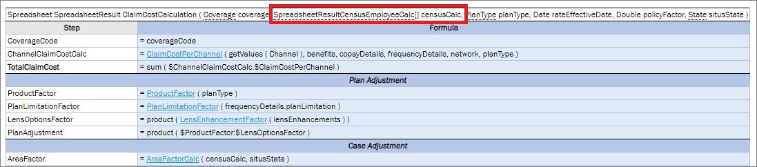 There is no need to specify a custom SpreadsheetResult data type in the header of the spreadsheet table itself. The return data type is still SpreadsheetResult. Only when passing such spreadsheet as input to another table, the full name must be declared. For example, if the CensusEmployeeCalc spreadsheet is an input parameter for the ClaimCostCalculation spreadsheet, (SpreadsheetResultCensusEmployeeCalc censusCalc) must be included in the list of inputs.