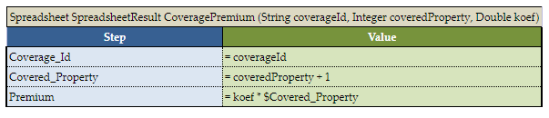 - If the united spreadsheet result is generated as a result of the rule returning spreadsheet results, the input parameter has the (SpreadsheetResultSpreadsheetName inputValueName) format. Example: SpreadsheetResultClaimCost claimCostCalc.