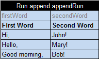 This example assumes there is a rule append defined with two input parameters, firstWord and secondWord. The run table calls this rule three times with three different sets of input values.