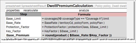 To provide an illustrative example of how to use variation related properties, consider the Spreadsheet rule DwellPremiumCalculation, as displayed in the following figure, which calculates a home insurance premium quote. The quote includes calculations of Protection and Key factors which values are dependent on Coverage A limit as defined in the ProtectionFactor and KeyFactor simple rules. The insurer requests to vary Coverage A limit of the quote to verify how limit variations impact the Key factor.