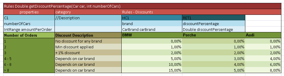 The following illustration provides a very simple example of how to use a range data type. The value of discount percentage depends on the number of orders and is the same for 4 to 5 orders and 7 to 8 orders. A number of cars per order is defined as IntRange data type. For a number of orders from, for example, 6 to 8, the rule for calculating the discount percentage is the same: the discount percentage is 10.00% for BMW, 4.00% for Porsche, and 6.00% for Audi.