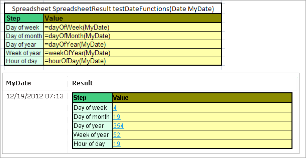 The following figure displays values returned by date functions for a particular input date specified in the MyDate field.
