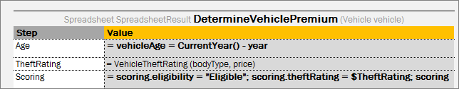 In the following example, the Age step calculates the age and stores the result in the vehicleAge field of the input object vehicle, the Scoring step calculates several scoring parameters, stores them in the scoring object, and returns the object with updated fields as a result of the step: