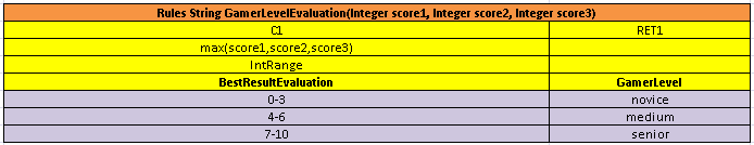 The following example illustrates how to use functions in OpenL Tablets. The rule in the diagram defines a gamer level depending on the best result in three attempts.