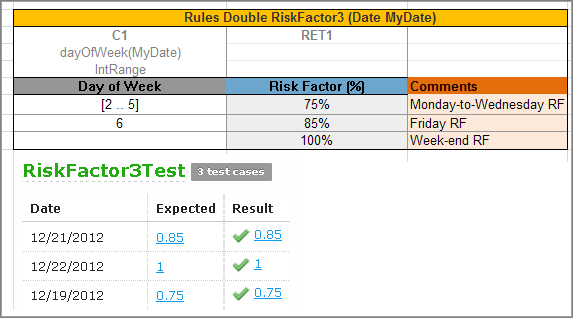 The following decision table provides a very simple example of how the dayOfWeek function can be used when the returned value, Risk Factor, depends on the day of the week.