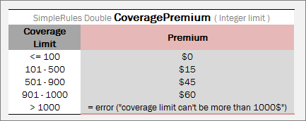In the following example, if the value for a coverage limit of an insurance policy exceeds 1000$, a rule notifies a user about wrong limit value and stops further processing.